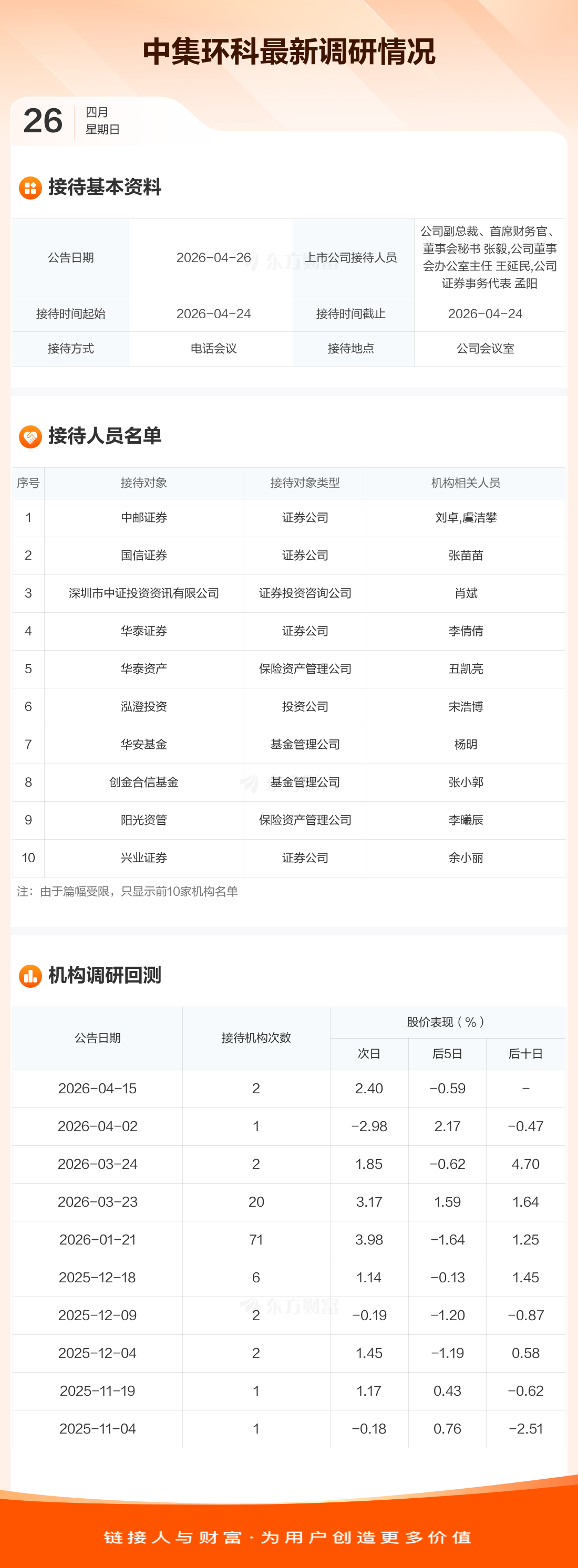 中集环科4月26日公告称,4月24日接待中邮证券等11家机构调研。接待人员包括公司副总裁、首席财务官、董事会秘书 张毅,公司董事会办公室主任 王延民,公司证券事务代表 孟阳。