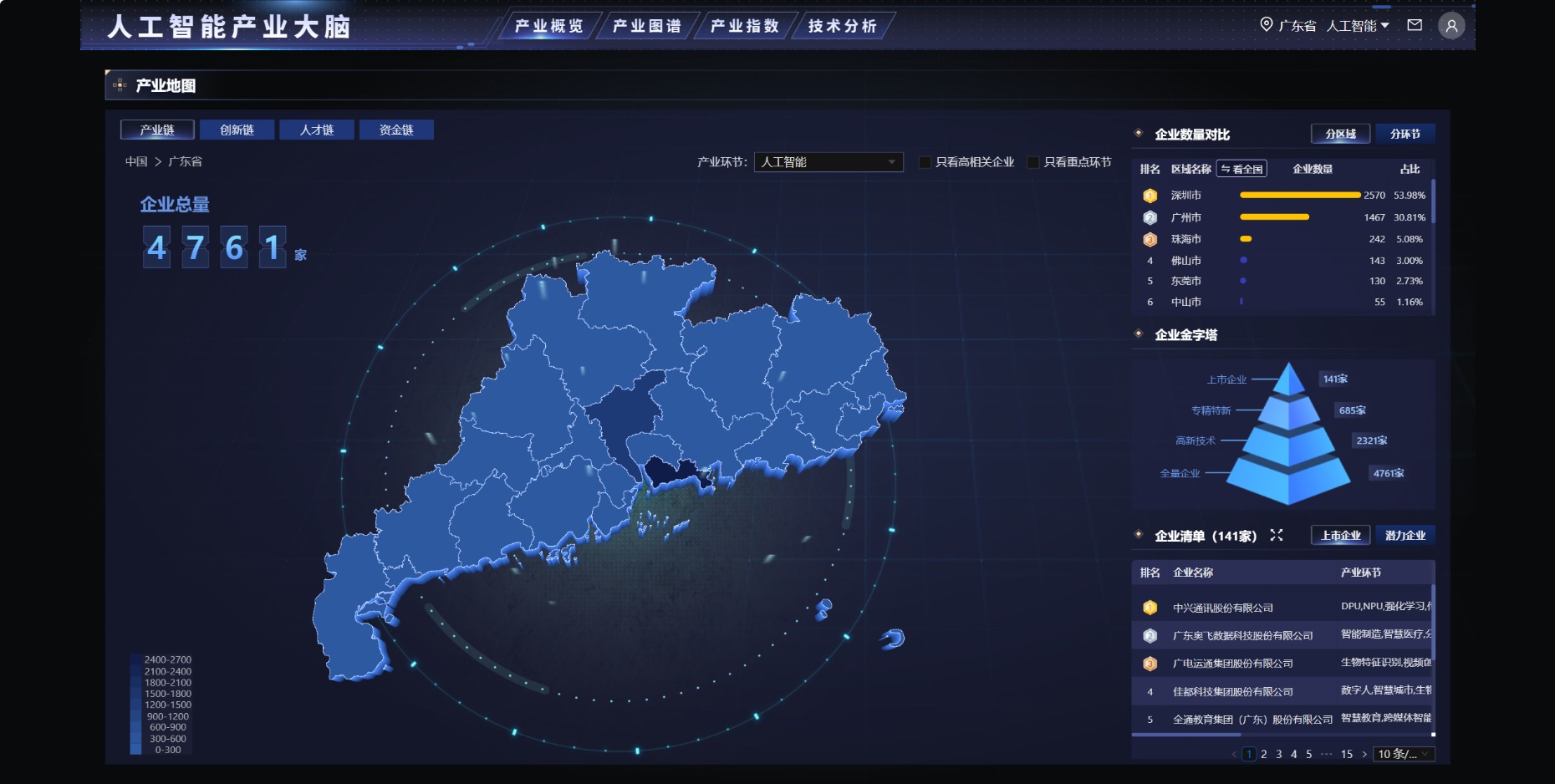 简单理解,这是一个面向政府用户的产业分析决策智能中枢。它针对产业底数难摸清、产业优劣难判断、兄弟城市竞争力难比较、未来技术储备难挖掘等产业治理中长期面临的“看不清、看不全、看不准”痛点,深度融合14大产业要素数据,整合全球400亿+产业数据要素、日更新量超300万,对全省21个地市的产业链、创新链、人才链、资金链、技术链进行动态追踪,实现产业运行状态实时感知与全景呈现,最终让全省人工智能产业治理从“经验判断”走向“数据驱动”。