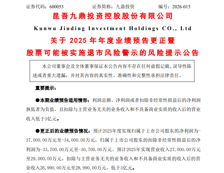 经过本次更正,九鼎投资预计亏损面将进一步扩大,且营收降至3亿元,触及“年度经审计的利润总额、净利润、扣除非经常性损益后的净利润孰低者为负值,且扣除后营业收入低于3亿元”的退市风险警示指标。