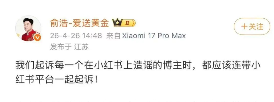 他还表示,起诉平台上的造谣博主时,理应连带起诉小红书平台本身,正是全行业对平台的忌惮,才纵容了其肆意推送未经证实的假消息、肆意妄为。