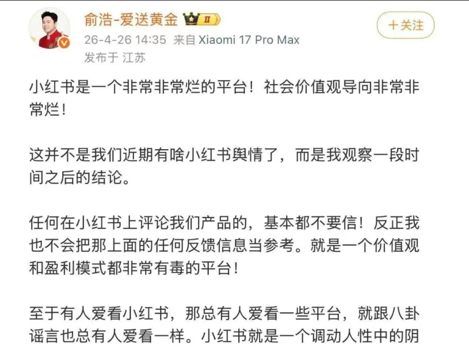 追觅CEO俞浩发文炮轰小红书:一个非常非常烂的平台!