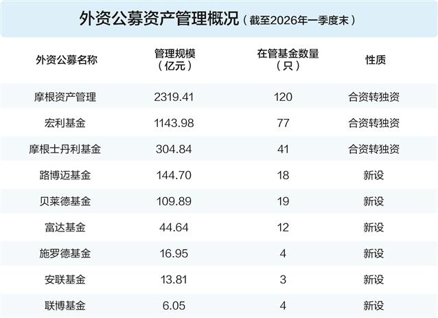 从规模表现来看,这种差异已逐步显现。Wind数据显示,截至2026年一季度,合资转独资机构在管理规模上保持领先。其中,摩根资产管理的管理规模已超过2300亿元,成为目前唯一一家规模突破2000亿元的外资公募;宏利基金规模超过1100亿元,摩根士丹利基金亦达到305亿元,整体处于数百亿元区间,具备较为稳固的市场基础。