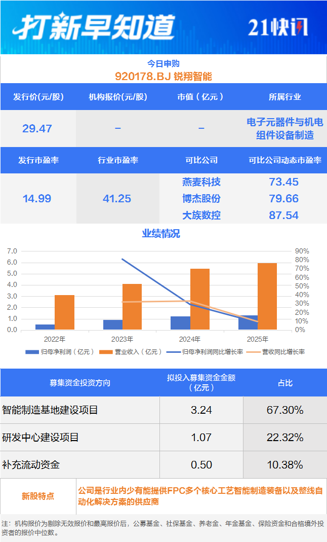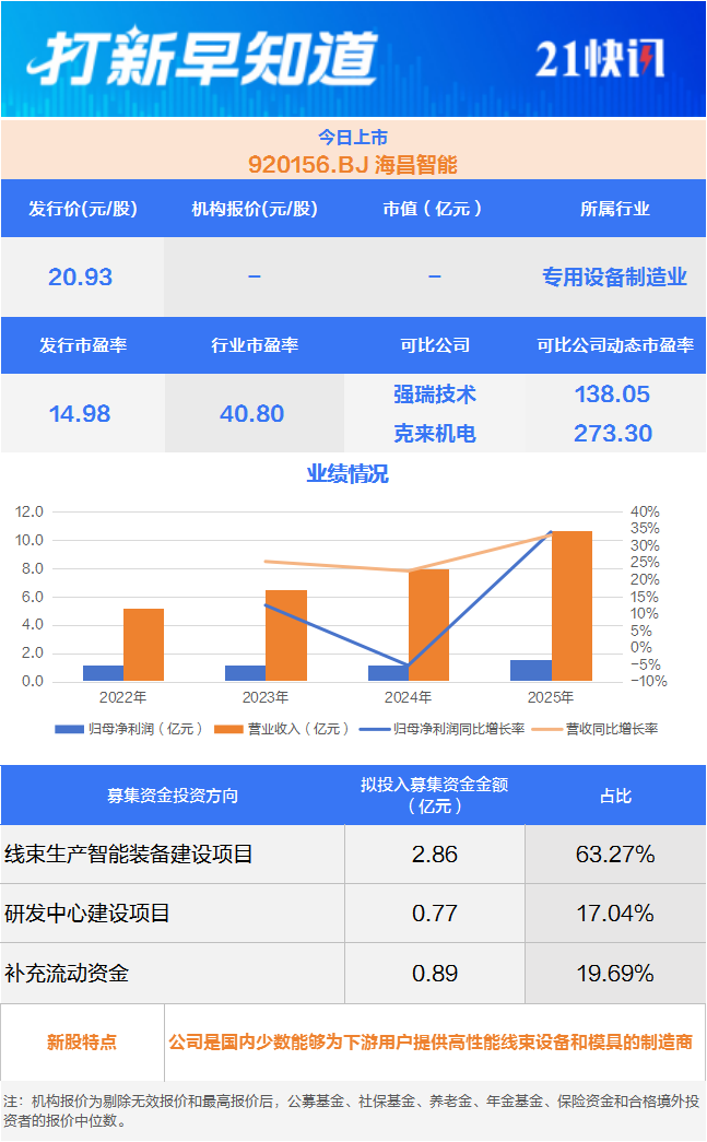 4月27日,可申购主板的长裕集团(603407.SH)与北交所的锐翔智能(920178.BJ),另有一只新股上市,为北交所的海昌智能(920156.BJ)。