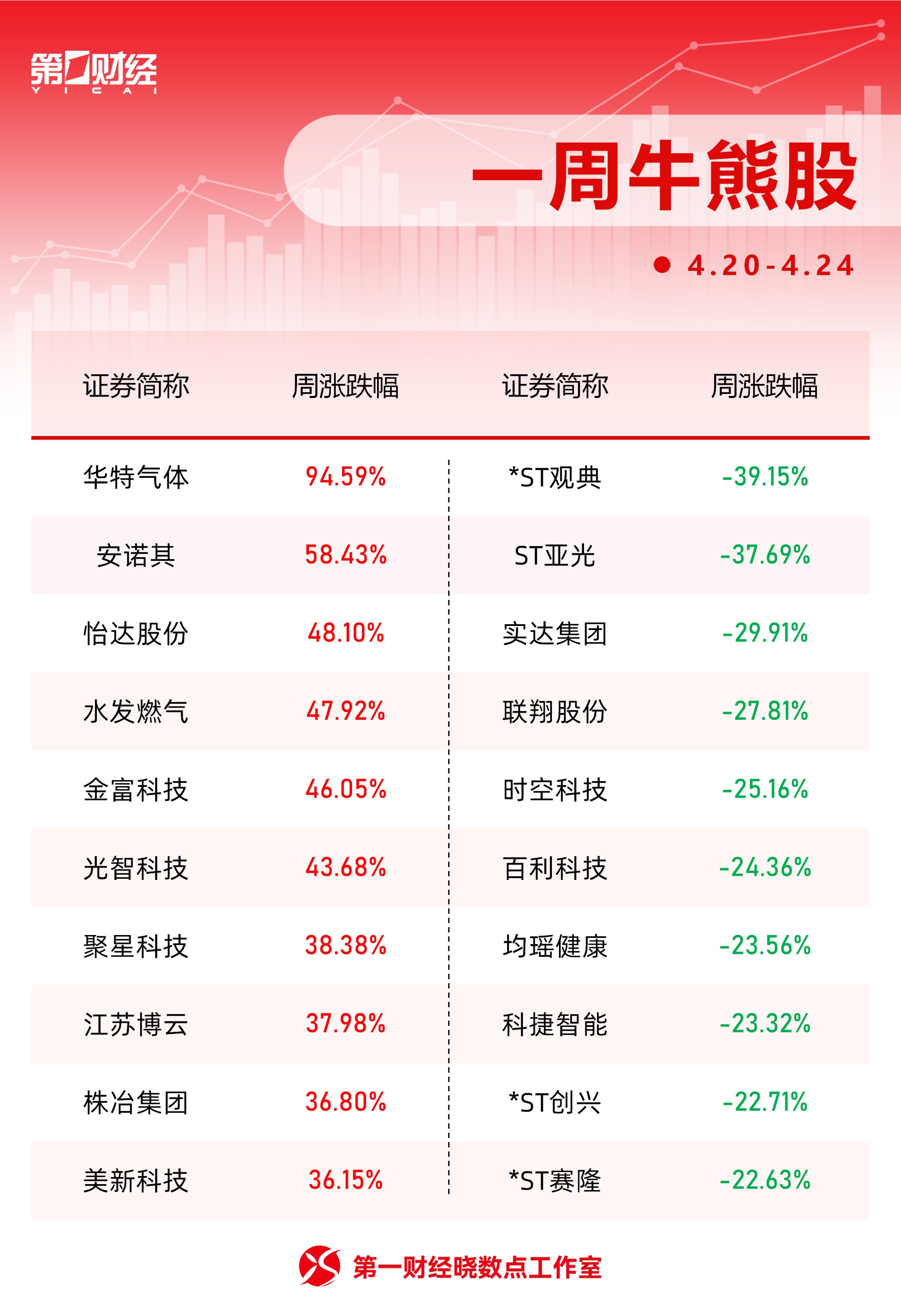 Wind数据显示,4月20日至4月24日共有6只个股涨幅超40%,有19只个股涨幅超30%。