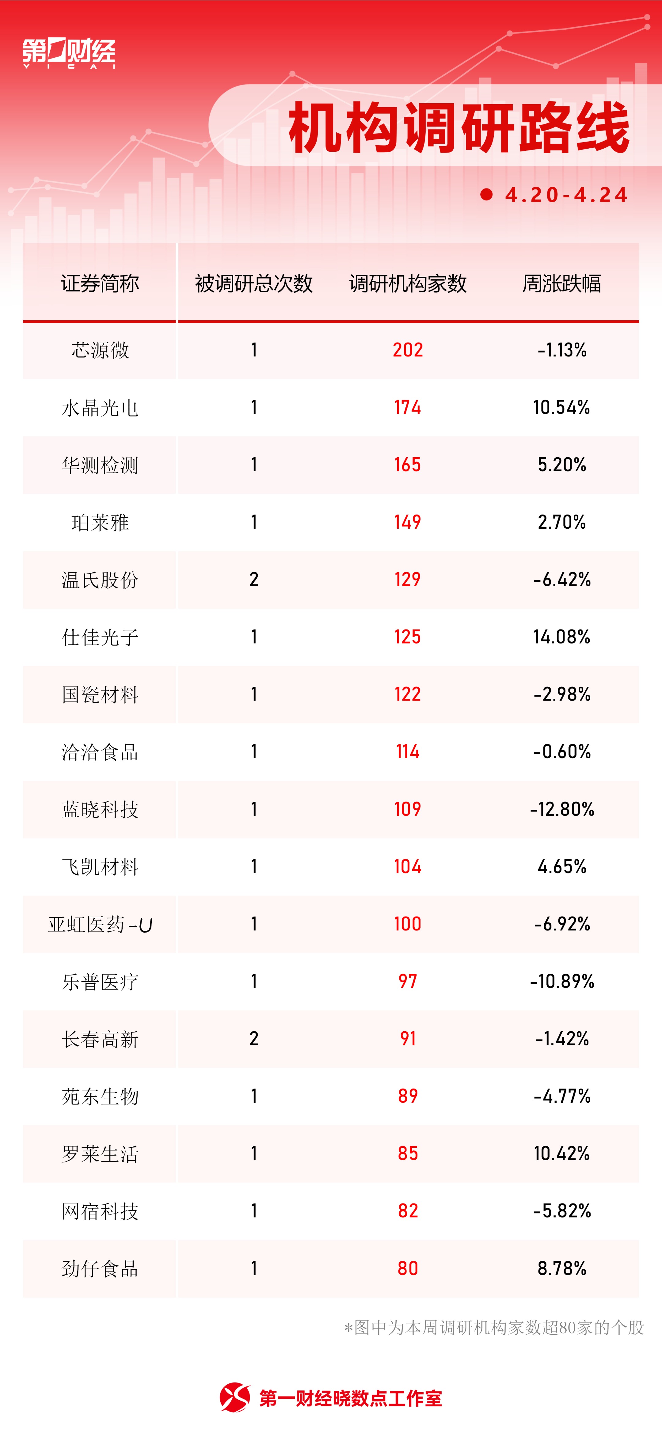 Wind数据显示,机构4月20日至4月24日共调研了385家上市公司,其中芯源微最获关注,参与调研的机构为202家。水晶光电、华测检测、珀莱雅分别获174家、165家、149家机构调研。