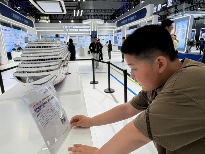 安徽合肥的小学四年级学生蒋一楠对来自上海的“爱达·魔都号”邮轮模型恋恋不舍。在上海(长三角)国际科技创新中心展区,记者问他感受如何,他竖起大拇指,回答言简意赅:“Very good(非常好)!”