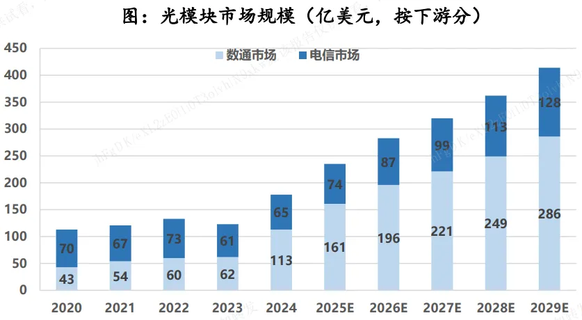 随着大规模基建开始,1.6T有望逐步进入主流应用阶段,而3.2T也开始进入预研阶段。2024年全球光模块市场约为178亿美元(约合人民币1246亿元),2025年预计在235亿美元(约合1645亿元),预计到2029年市场规模将达到415亿美元(约合2905亿元),2024-2029CAGR约为18%。