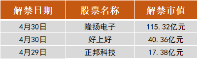 Wind数据显示,本周(4月27日—4月30日)四个交易日将有23只股票面临限售股解禁,合计解禁量为13.12亿股。按4月24日收盘价计算,合计解禁市值为254.95亿元。其中,解禁市值居前三位的是:隆扬电子(115.32亿元)、好上好(40.36亿元)、正邦科技(17.38亿元)。