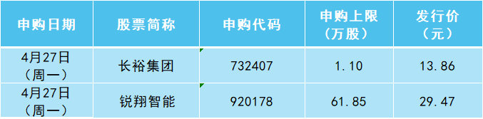 本周A股有2只新股发行,分别为沪市新股长裕集团和北交所锐翔智能,均为周一开启申购