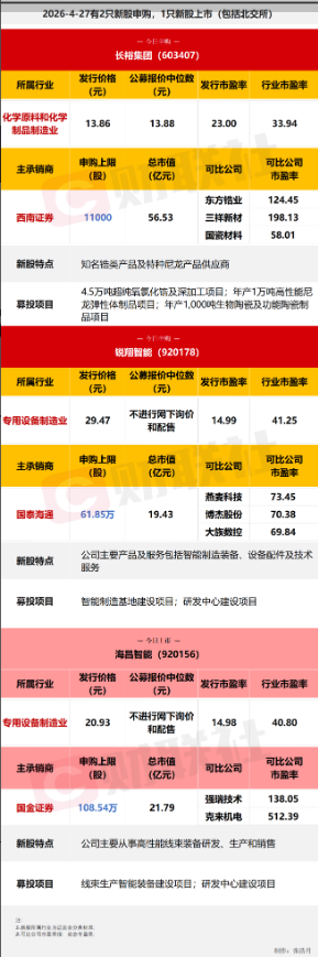 今日有2只新股申购,分别为沪市主板的长裕集团,北交所的锐翔智能;1只新股上市,为北交所的海昌智能。
