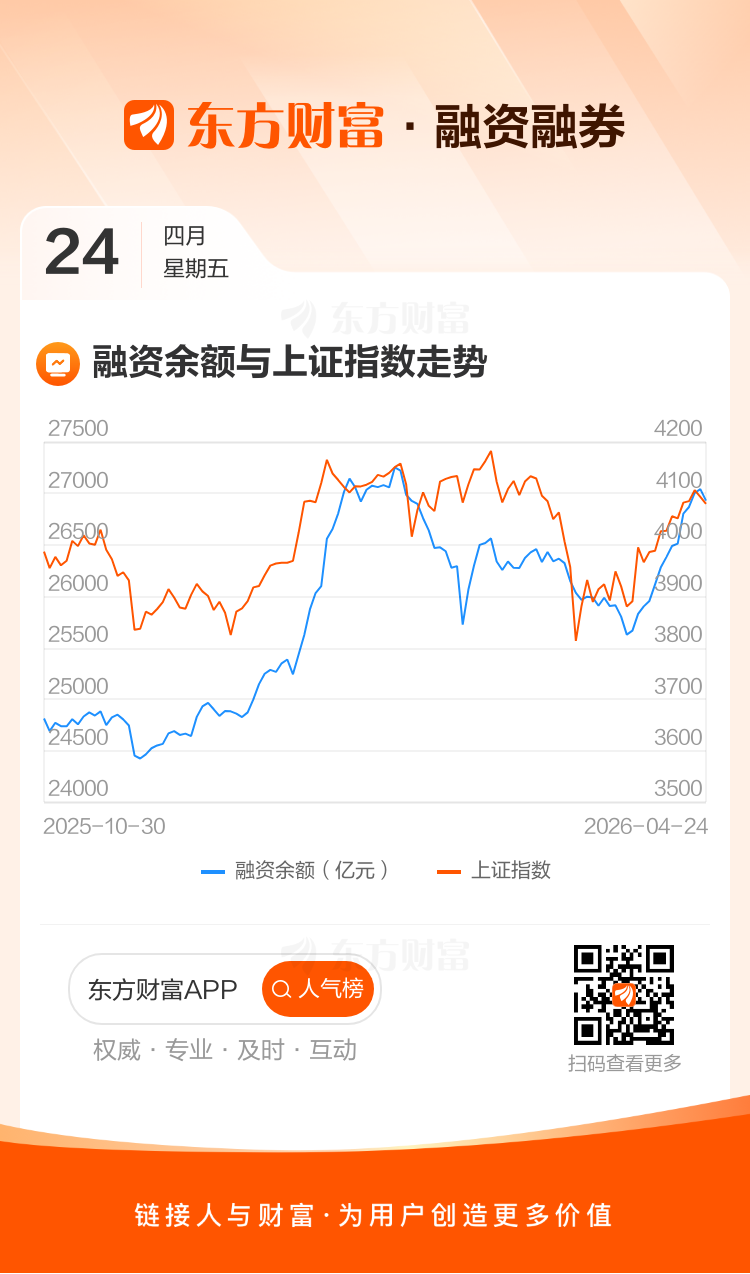 04月24日A股三大指数集体收跌,杠杆资金呈净卖出之势,当天融资余额2.69万亿,较上一交易日减少112.37亿。