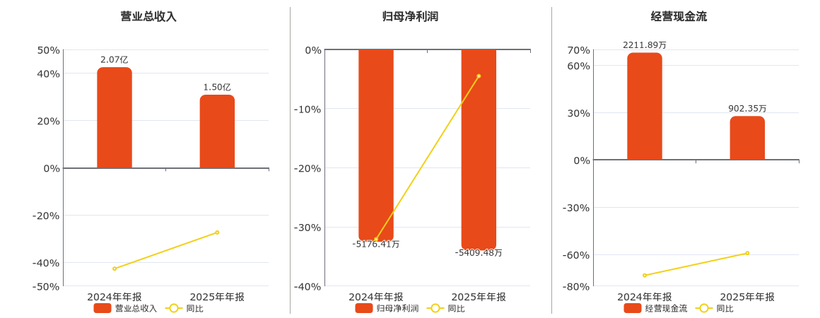 公司营业总收入为1.50亿元,在已披露的同业公司中排名第61,较去年同报告期营业总收入减少5660.90万元,同比较去年同期下降27.37%。归母净利润为-5409.48万元,在已披露的同业公司中排名第54,较去年同报告期归母净利润减少233.07万元。经营活动现金净流入为902.35万元,在已披露的同业公司中排名第52,较去年同报告期经营活动现金净流入减少1309.54万元,同比较去年同期下降59.20%。