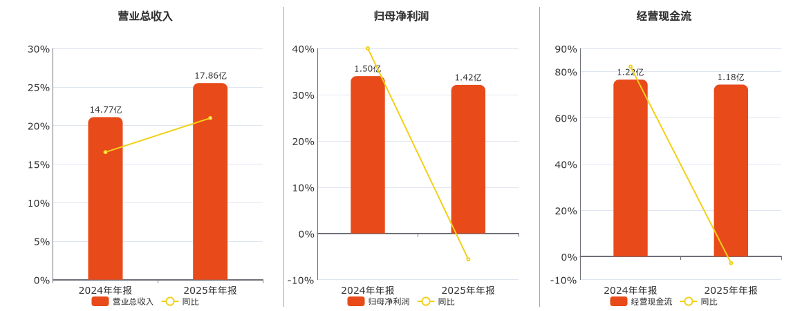 公司营业总收入为17.86亿元。归母净利润为1.42亿元,较去年同报告期归母净利润减少840.91万元,同比较去年同期下降5.59%。经营活动现金净流入为1.18亿元,在已披露的同业公司中排名第41,较去年同报告期经营活动现金净流入减少343.29万元,同比较去年同期下降2.82%。