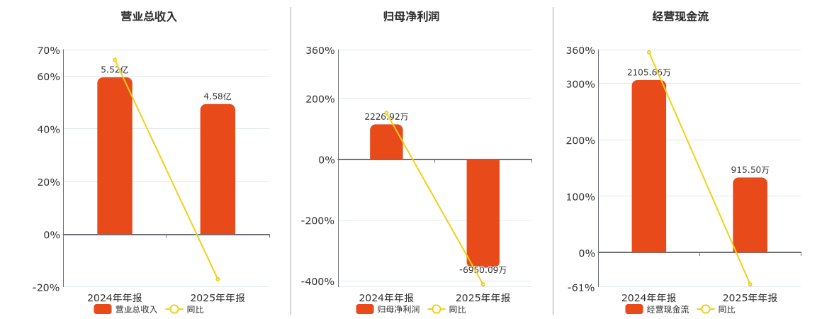 公司营业总收入为4.58亿元,在已披露的同业公司中排名第12,较去年同报告期营业总收入减少9419.31万元,同比较去年同期下降17.07%。归母净利润为-6950.09万元,在已披露的同业公司中排名第12,较去年同报告期归母净利润减少9177.01万元,同比较去年同期下降412.09%。经营活动现金净流入为915.50万元,在已披露的同业公司中排名第11,较去年同报告期经营活动现金净流入减少1190.16万元,同比较去年同期下降56.52%。