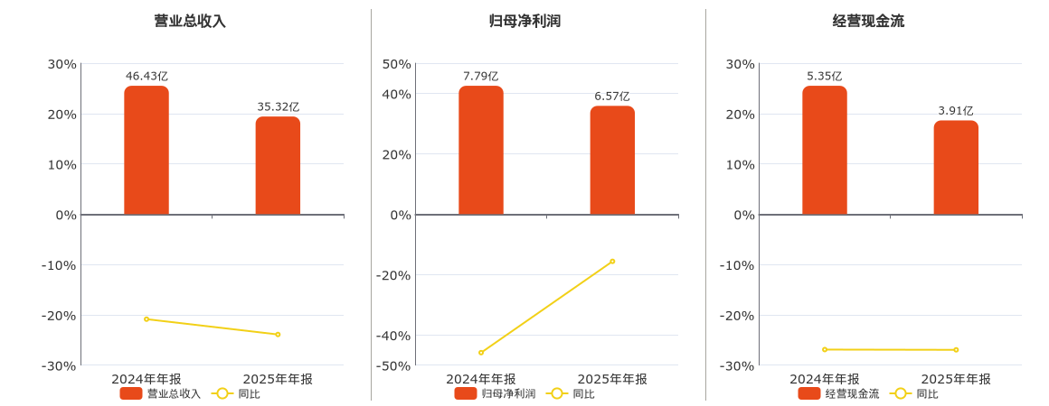 公司营业总收入为35.32亿元,在已披露的同业公司中排名第31,较去年同报告期营业总收入减少11.10亿元,同比较去年同期下降23.92%。归母净利润为6.57亿元,较去年同报告期归母净利润减少1.22亿元,同比较去年同期下降15.64%。经营活动现金净流入为3.91亿元,在已披露的同业公司中排名第26,较去年同报告期经营活动现金净流入减少1.44亿元,同比较去年同期下降26.97%。