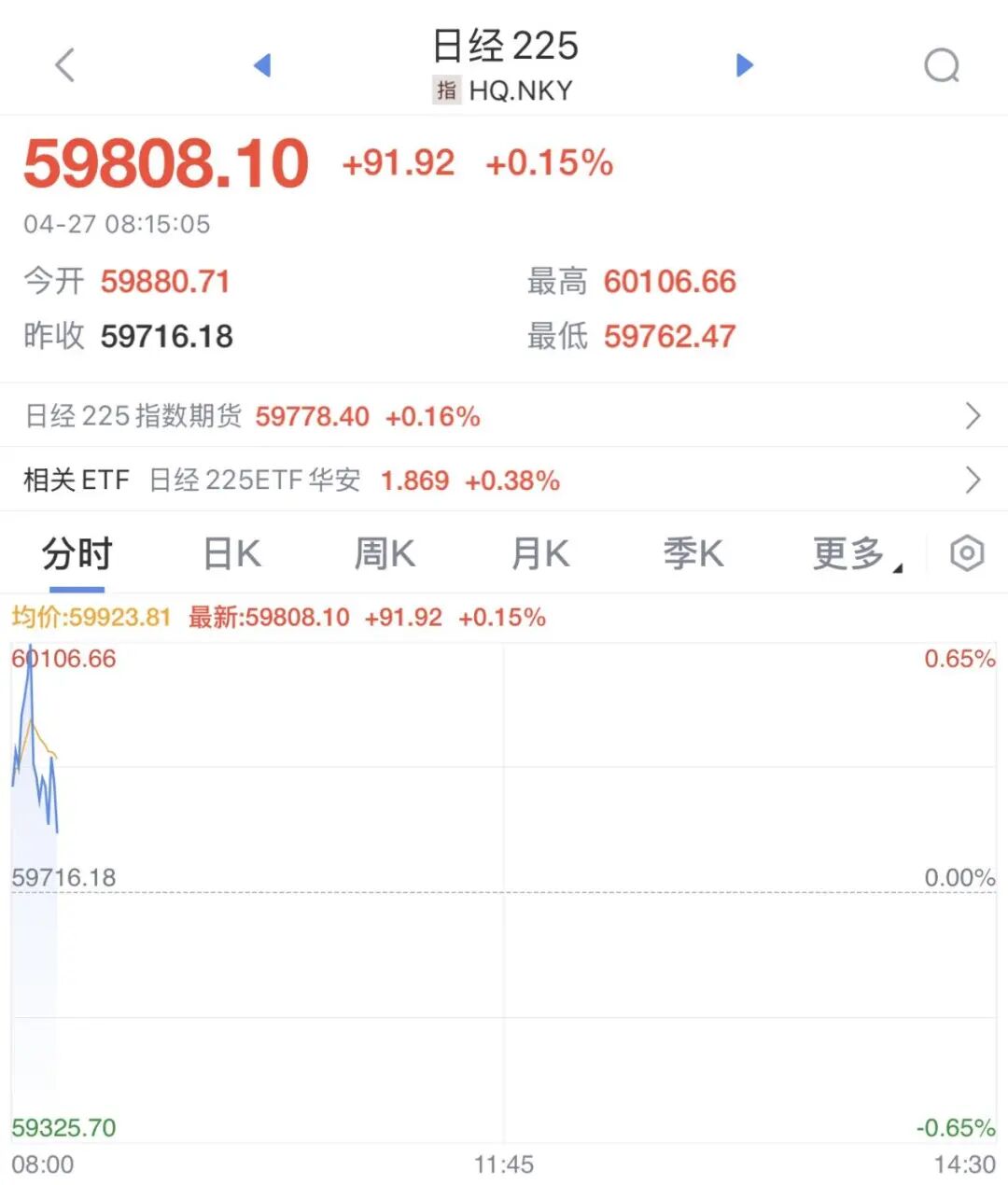 日本股市高开后震荡下挫,日经225指数现报59808.1点,涨幅为0.15%。