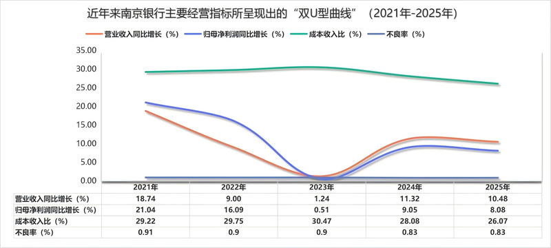 对此,南京银行2025年的回应是——实现营业收入555.42亿元,同比增长10.48%;归母净利润218.07亿元,同比增长8.08%;成本收入比同比下降2.01个百分点,不良贷款率维持在0.83%的较低水平。在银行业普遍面临息差收窄压力的背景下,这一“双U型曲线”格局尤为难得。
