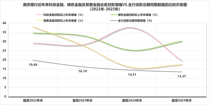 在规模与效益增长的背后,对于金融机构来说,往往是信贷结构的深层调整。近年来,南京银行紧扣金融“五篇大文章”,加力支持新质生产力、绿色转型、普惠小微等重点领域的融资支持,其贷款增幅水平保持在全行贷款总额同期增幅之上,资产布局的“时代感”显著增强。