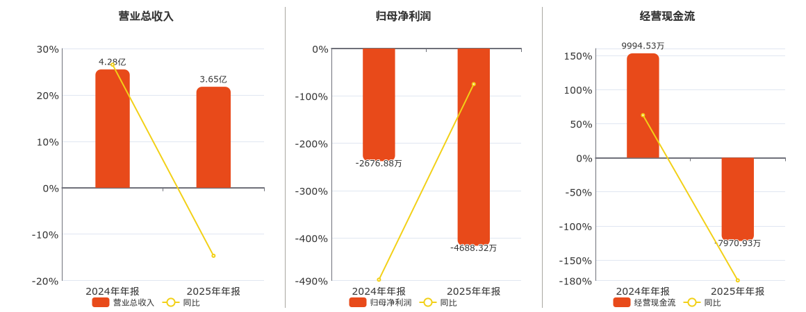 公司营业总收入为3.65亿元,在已披露的同业公司中排名第99,较去年同报告期营业总收入减少6275.50万元,同比较去年同期下降14.66%。归母净利润为-4688.32万元,在已披露的同业公司中排名第96,较去年同报告期归母净利润减少2011.44万元。经营活动现金净流入为-7970.93万元,在已披露的同业公司中排名第100,较去年同报告期经营活动现金净流入减少1.80亿元,同比较去年同期下降179.75%。