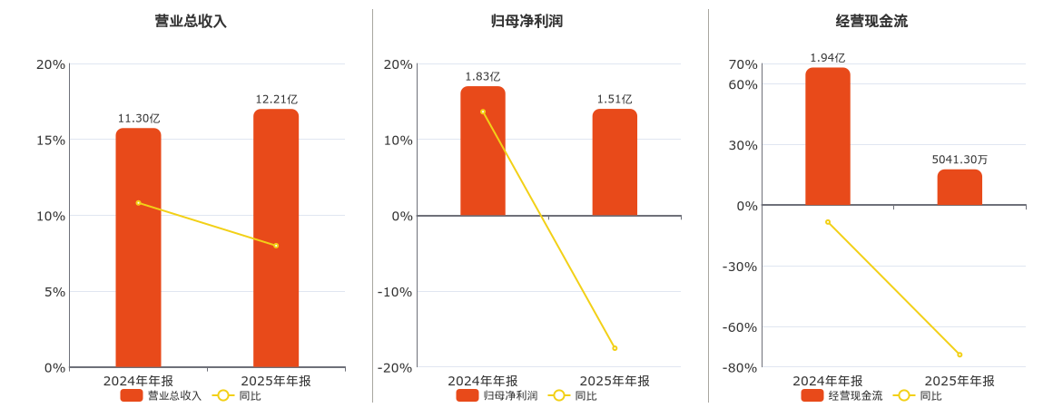 公司营业总收入为12.21亿元。归母净利润为1.51亿元,较去年同报告期归母净利润减少3217.78万元,同比较去年同期下降17.54%。经营活动现金净流入为5041.30万元,在已披露的同业公司中排名第113,较去年同报告期经营活动现金净流入减少1.44亿元,同比较去年同期下降74.01%。
