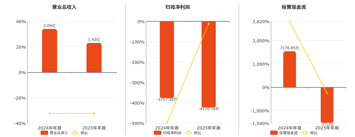公司营业总收入为1.42亿元,在已披露的同业公司中排名第28,较去年同报告期营业总收入减少6743.24万元,同比较去年同期下降32.25%。归母净利润为-4170.78万元,在已披露的同业公司中排名第19,较去年同报告期归母净利润减少453.48万元。经营活动现金净流入为-1.12亿元,在已披露的同业公司中排名第25,较去年同报告期经营活动现金净流入减少1.84亿元,同比较去年同期下降255.74%。