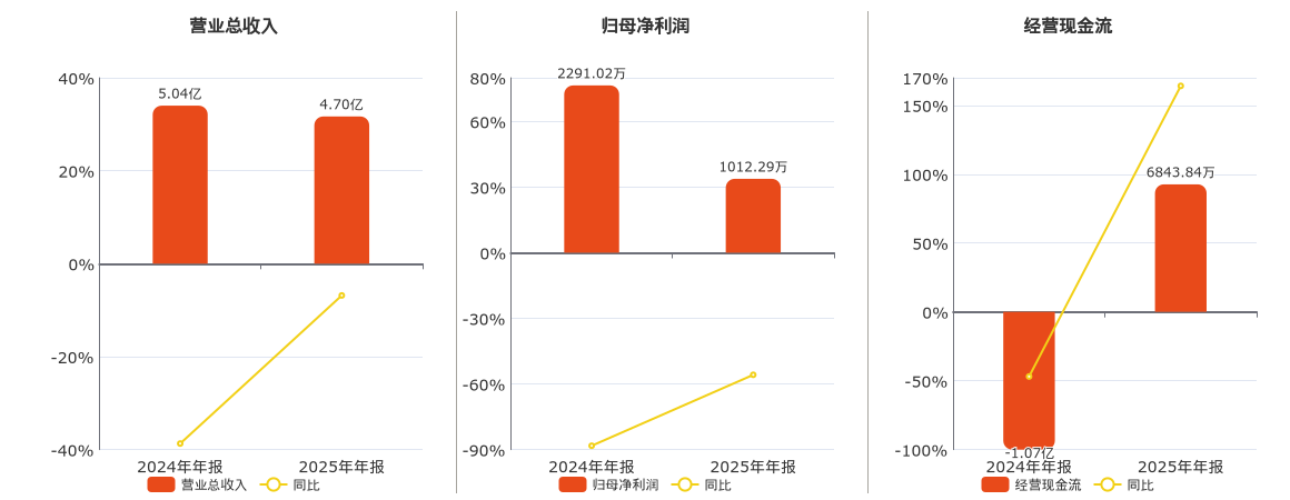 公司营业总收入为4.70亿元,在已披露的同业公司中排名第113,较去年同报告期营业总收入减少3444.88万元,同比较去年同期下降6.83%。归母净利润为1012.29万元,在已披露的同业公司中排名第98,较去年同报告期归母净利润减少1278.73万元,同比较去年同期下降55.81%。经营活动现金净流入为6843.84万元,在已披露的同业公司中排名第81。