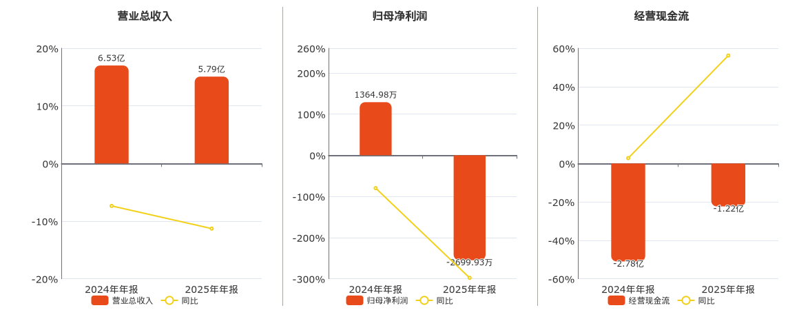 公司营业总收入为5.79亿元,在已披露的同业公司中排名第50,较去年同报告期营业总收入减少7376.74万元,同比较去年同期下降11.30%。归母净利润为-2699.93万元,在已披露的同业公司中排名第51,较去年同报告期归母净利润减少4064.90万元,同比较去年同期下降297.80%。经营活动现金净流入为-1.22亿元,在已披露的同业公司中排名第63。