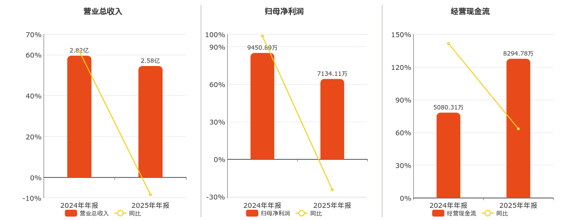 公司营业总收入为2.58亿元,在已披露的同业公司中排名第20,较去年同报告期营业总收入减少2391.43万元,同比较去年同期下降8.47%。归母净利润为7134.11万元,在已披露的同业公司中排名第15,较去年同报告期归母净利润减少2316.78万元,同比较去年同期下降24.51%。经营活动现金净流入为8294.78万元,在已披露的同业公司中排名第16。