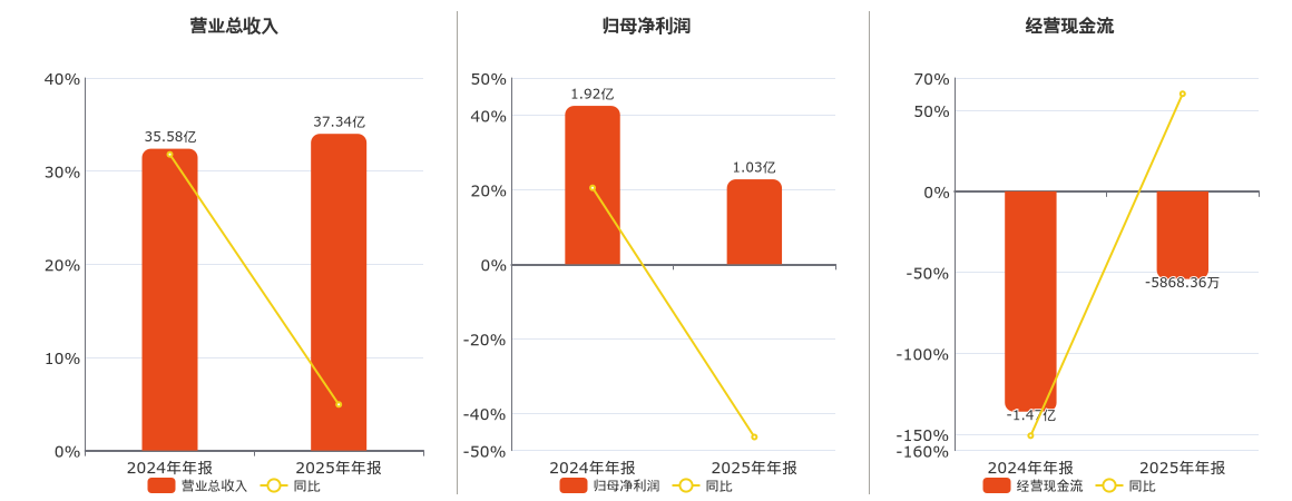 公司营业总收入为37.34亿元,在已披露的同业公司中排名第20。归母净利润为1.03亿元,在已披露的同业公司中排名第19,较去年同报告期归母净利润减少8881.82万元,同比较去年同期下降46.38%。经营活动现金净流入为-5868.36万元,在已披露的同业公司中排名第30。