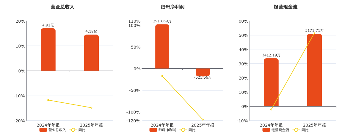 公司营业总收入为4.18亿元,在已披露的同业公司中排名第113,较去年同报告期营业总收入减少7296.99万元,同比较去年同期下降14.87%。归母净利润为-521.56万元,在已披露的同业公司中排名第122,较去年同报告期归母净利润减少3435.25万元,同比较去年同期下降117.90%。经营活动现金净流入为5171.71万元,在已披露的同业公司中排名第91。