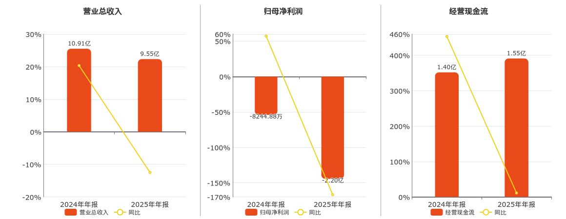 公司营业总收入为9.55亿元,在已披露的同业公司中排名第63,较去年同报告期营业总收入减少1.36亿元,同比较去年同期下降12.47%。归母净利润为-2.20亿元,在已披露的同业公司中排名第73,较去年同报告期归母净利润减少1.38亿元。经营活动现金净流入为1.55亿元,在已披露的同业公司中排名第44。