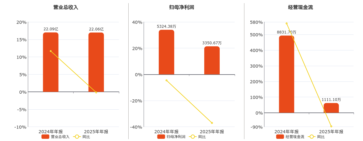 公司营业总收入为22.06亿元,较去年同报告期营业总收入减少365.20万元,同比较去年同期下降0.17%。归母净利润为3350.67万元,在已披露的同业公司中排名第35,较去年同报告期归母净利润减少1973.71万元,同比较去年同期下降37.07%。经营活动现金净流入为1111.10万元,在已披露的同业公司中排名第41,较去年同报告期经营活动现金净流入减少7720.60万元,同比较去年同期下降87.42%。