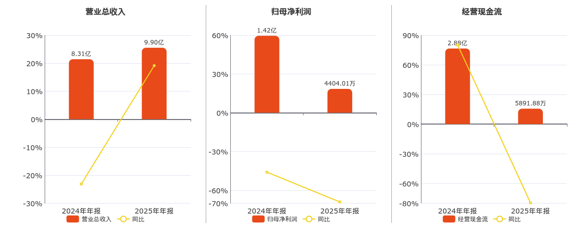 公司营业总收入为9.90亿元,在已披露的同业公司中排名第11。归母净利润为4404.01万元,在已披露的同业公司中排名第9,较去年同报告期归母净利润减少9808.33万元,同比较去年同期下降69.01%。经营活动现金净流入为5891.88万元,在已披露的同业公司中排名第9,较去年同报告期经营活动现金净流入减少2.30亿元,同比较去年同期下降79.58%。