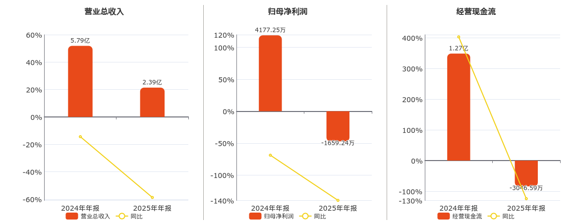 公司营业总收入为2.39亿元,在已披露的同业公司中排名第23,较去年同报告期营业总收入减少3.40亿元,同比较去年同期下降58.77%。归母净利润为-1659.24万元,在已披露的同业公司中排名第22,较去年同报告期归母净利润减少5836.49万元,同比较去年同期下降139.72%。经营活动现金净流入为-3046.59万元,在已披露的同业公司中排名第25,较去年同报告期经营活动现金净流入减少1.57亿元,同比较去年同期下降124.08%。