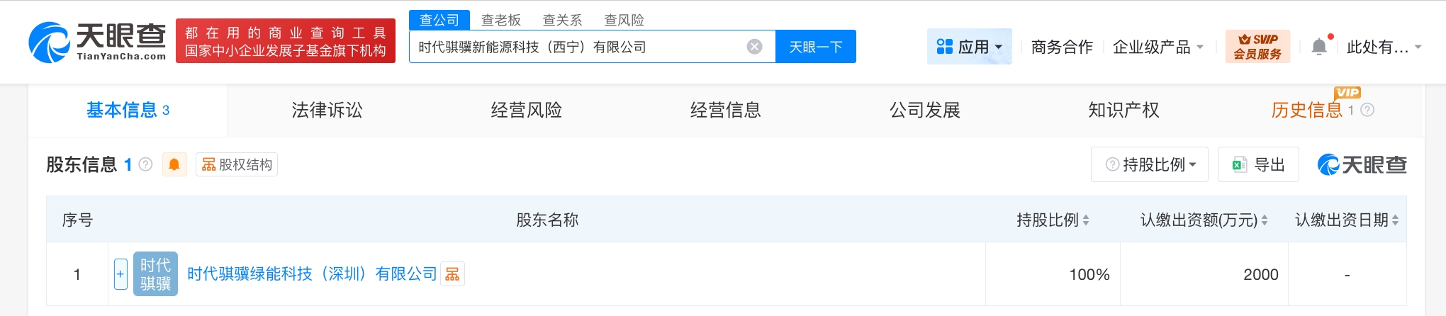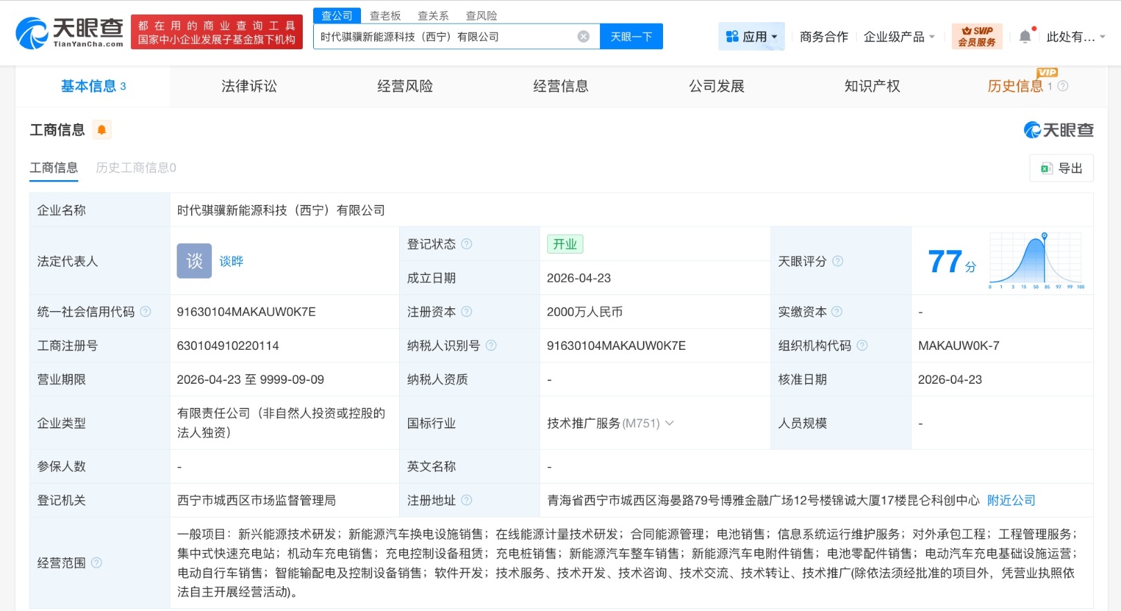 南方财经4月27日电,天眼查App显示,近日,时代骐骥新能源科技(西宁)有限公司成立,法定代表人为谈晔,注册资本2000万人民币,经营范围含新兴能源技术研发、新能源汽车换电设施销售、在线能源计量技术研发、合同能源管理、电池销售、信息系统运行维护服务、工程管理服务、集中式快速充电站、机动车充电销售等。股东信息显示,该公司由宁德时代(300750)旗下时代骐骥绿能科技(深圳)有限公司全资持股。