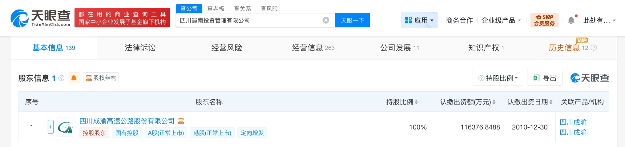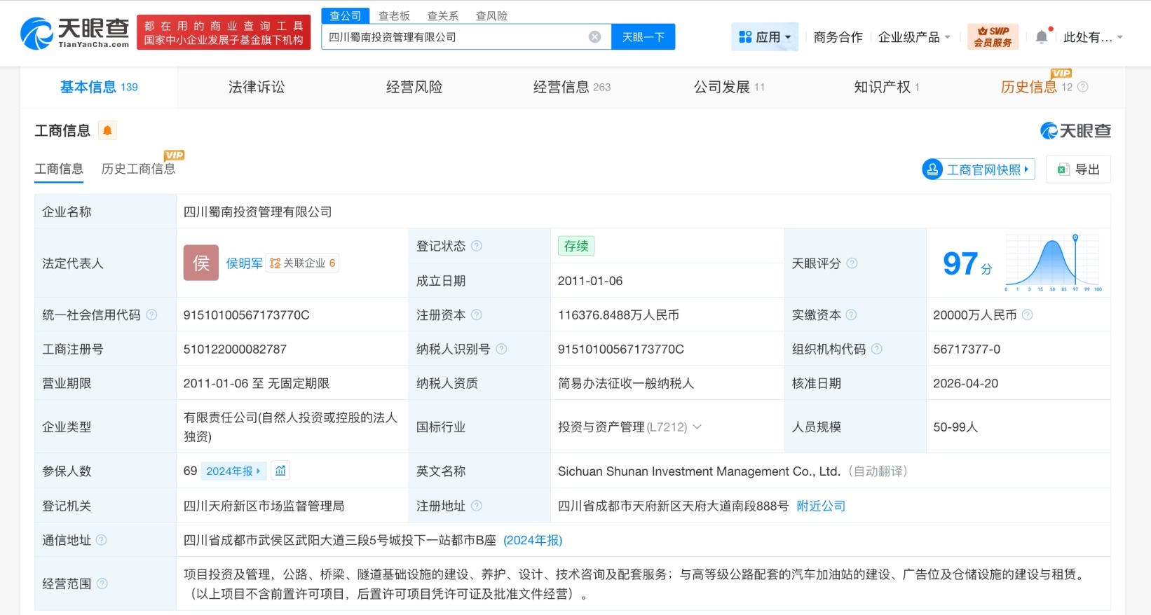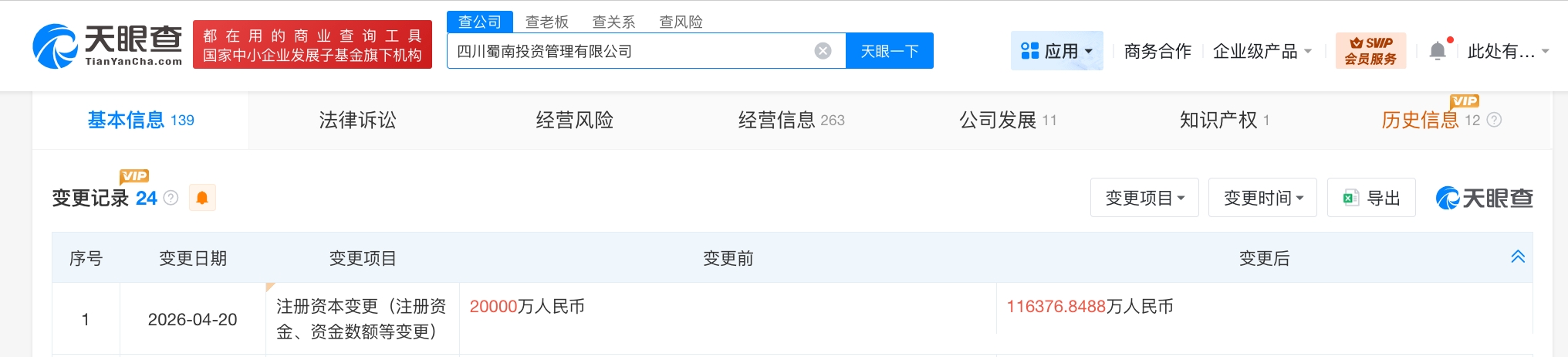 南方财经4月27日电,天眼查App显示,近日,四川蜀南投资管理有限公司发生工商变更,注册资本由2亿人民币增至约11.6亿人民币,增幅约482%。该公司成立于2011年1月,法定代表人为侯明军,经营范围为项目投资及管理,公路、桥梁、隧道基础设施的建设、养护、设计、技术咨询及配套服务,与高等级公路配套的汽车加油站的建设、广告位及仓储设施的建设与租赁,由四川成渝(601107)全资持股。