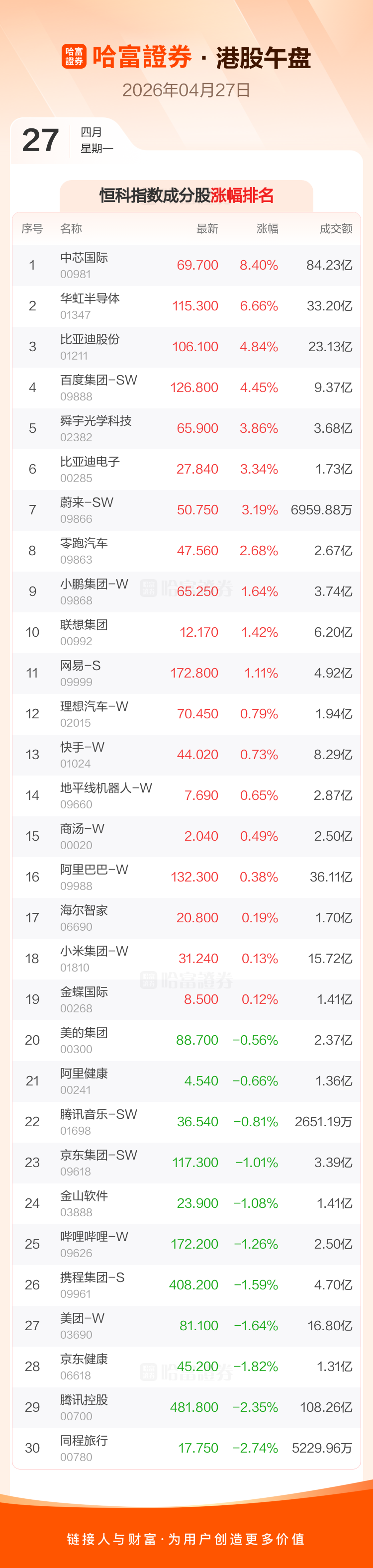 港股4月27日午盘走高,恒生指数收报26016.21点,涨38.14点,涨幅0.15%;恒生科技指数收报4966.34点,涨64.14点,涨幅1.31%。恒生指数成分股中中芯国际、比亚迪股份、百度集团-SW涨幅居前,国药控股、洛阳钼业、华润置地跌幅靠前。恒生科技指数成分股中中芯国际、华虹半导体、比亚迪股份涨幅居前,同程旅行、腾讯控股、京东健康跌幅靠前。