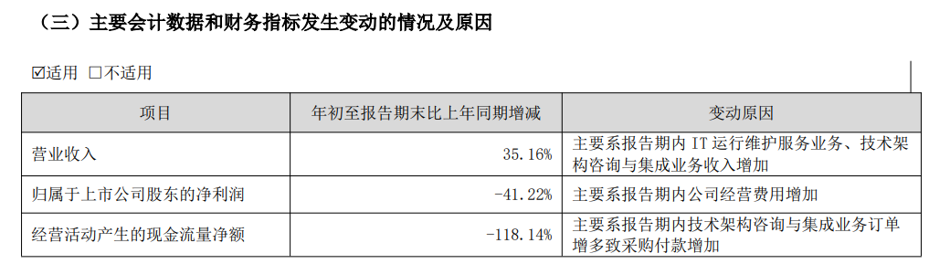 在一季报中,中亦科技对公司部分主要会计数据和财务指标发生变动的情况及原因做了说明。其中,营业收入增长35.16%,主要系报告期内IT运行维护服务业务、技术架构咨询与集成业务收入增加;归属于上市公司股东的净利润减少41.22%,主要系报告期内公司经营费用增加;经营活动产生的现金流量净额减少118.14%,主要系报告期内技术架构咨询与集成业务订单增多致采购付款增加。