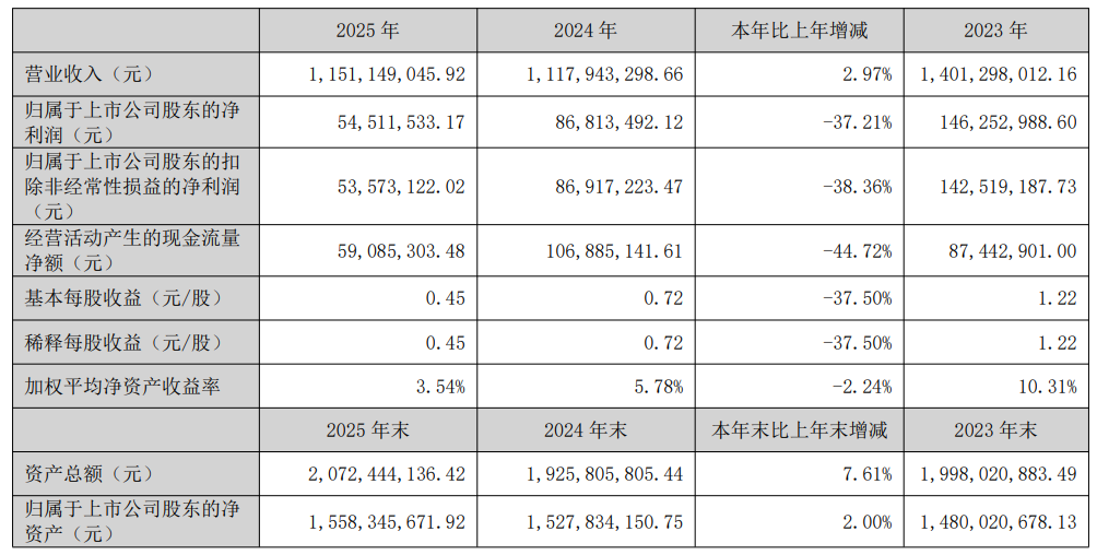 中亦科技(301208)2025年年报显示,公司营业收入为11.51亿元,同比上升2.97%;归母净利润为5451万元,同比下降37.21%;扣非归母净利润为5357万元,同比下降38.36%;经营现金流净额为5909万元,同比下降44.72%。公司拟向全体股东每10股派发现金红利1.3元(含税)。