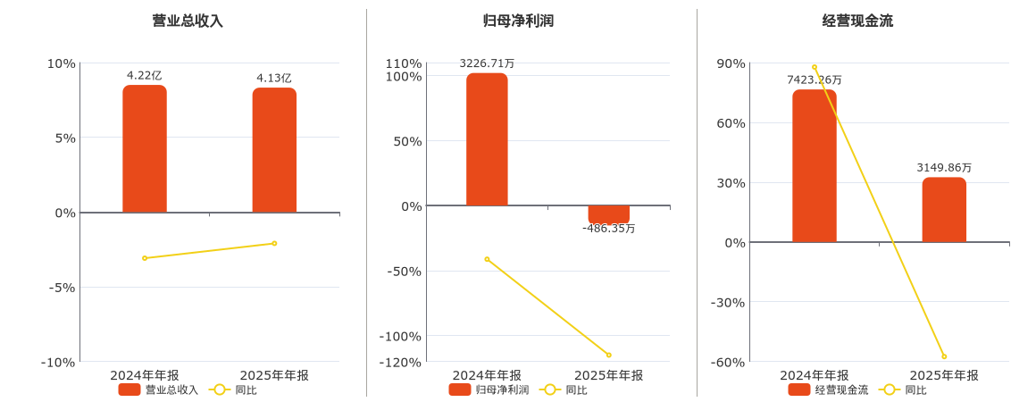 公司营业总收入为4.13亿元,在已披露的同业公司中排名第58,较去年同报告期营业总收入减少887.22万元,同比较去年同期下降2.10%。归母净利润为-486.35万元,在已披露的同业公司中排名第46,较去年同报告期归母净利润减少3713.06万元,同比较去年同期下降115.07%。经营活动现金净流入为3149.86万元,在已披露的同业公司中排名第51,较去年同报告期经营活动现金净流入减少4273.40万元,同比较去年同期下降57.57%。
