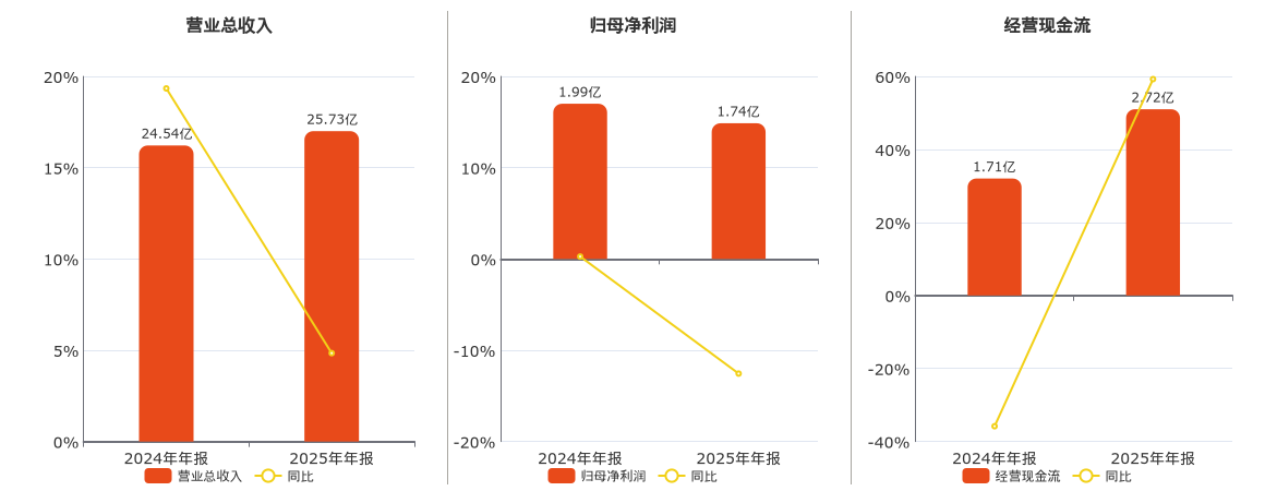 公司营业总收入为25.73亿元。归母净利润为1.74亿元,较去年同报告期归母净利润减少2493.03万元,同比较去年同期下降12.56%。经营活动现金净流入为2.72亿元。