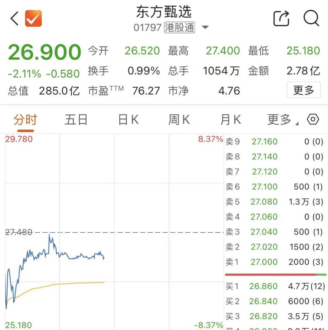 在四名人气主播相继宣布离职的消息冲击下,东方甄选4月27日大幅低开,盘中最大跌幅一度超8%,引发市场关注。截至发稿,该股报26.9港元/股,跌幅2.11%。