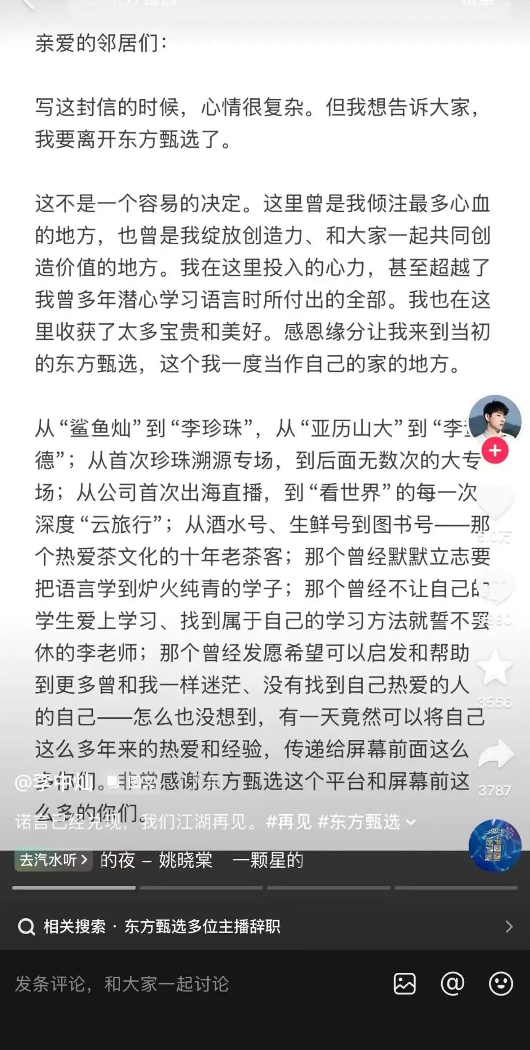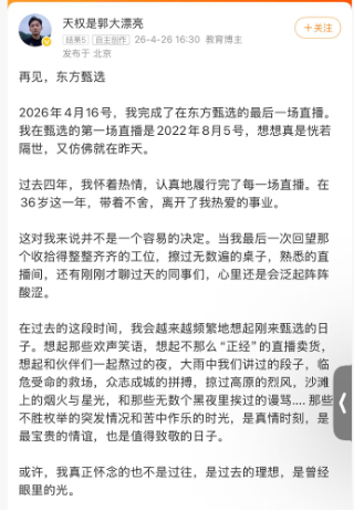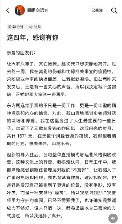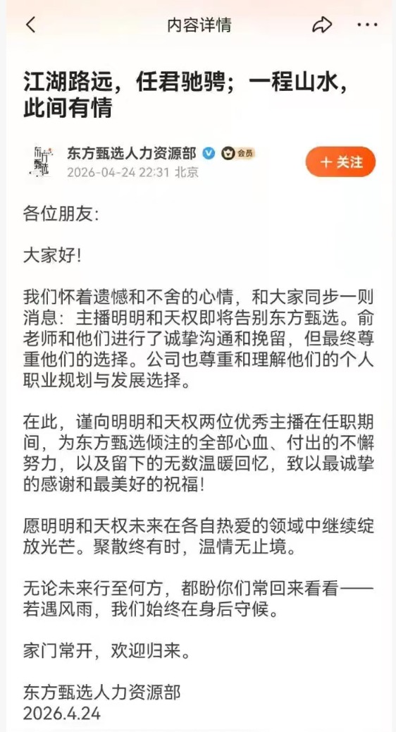 随后,离职潮扩大。4月25日,主播中灿和林林相继在个人社交平台发布告别内容,确认离开东方甄选。