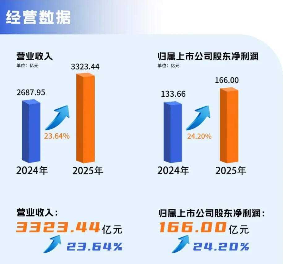 2025年全年,立讯精密实现营收3323.44亿元,同比增长23.64%;归母净利润为166亿元,同比增长24.20%。