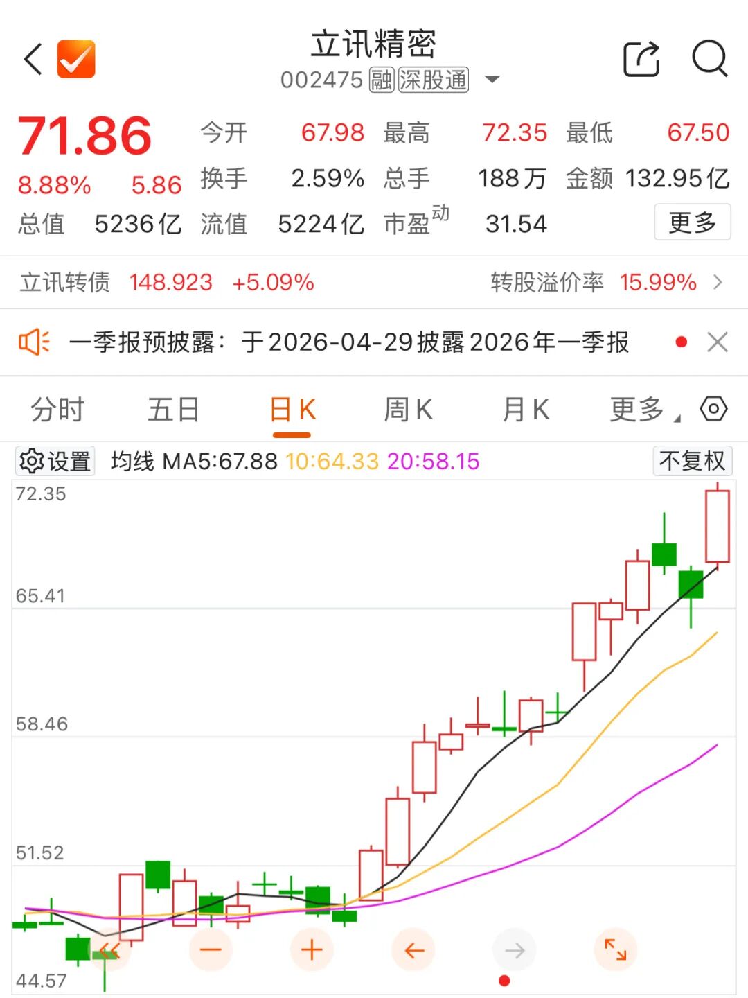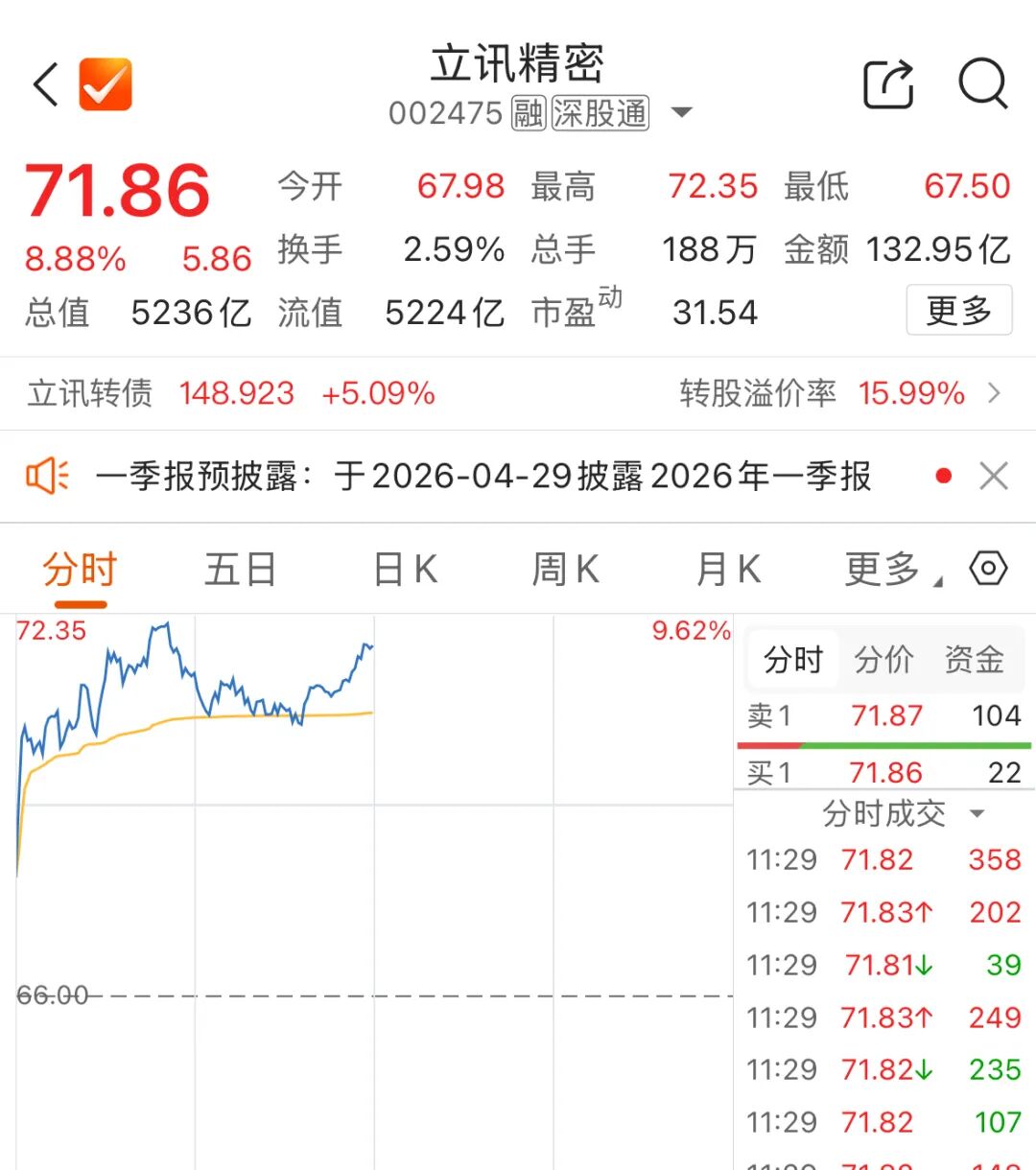 立讯精密27日盘中一度逼近涨停,最高报72.35元/股,创历史新高,总市值突破5200亿元。截至午间休市,立讯精密涨8.88%,报71.86元/股,半日成交近133亿元。
