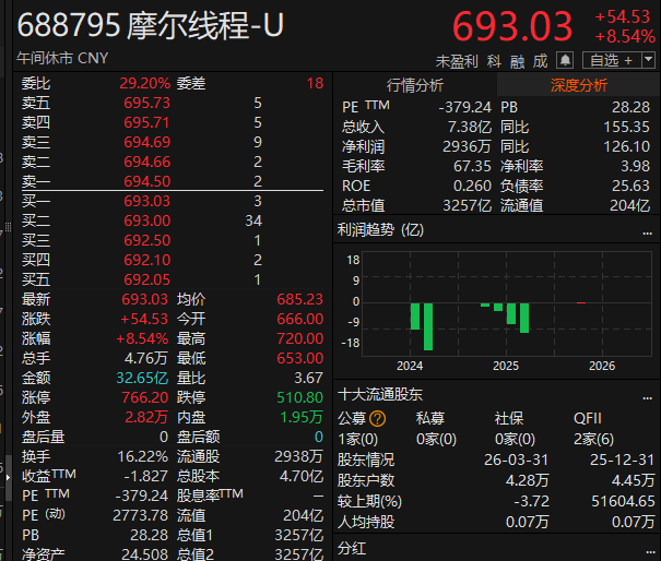 消息面上,摩尔线程2026年一季度实现营收7.38亿元,同比增长155.35%;实现归母净利润2935.92万元,同比扭亏为盈。公司2025年全年实现营收15.05亿元,同比增长243.37%;毛利总额达到9.87亿元,较上年同期增长218.43%;归母净利润、扣非后归母净利润分别为-10.01亿元、-10.88亿元,亏损额同比大幅收窄。