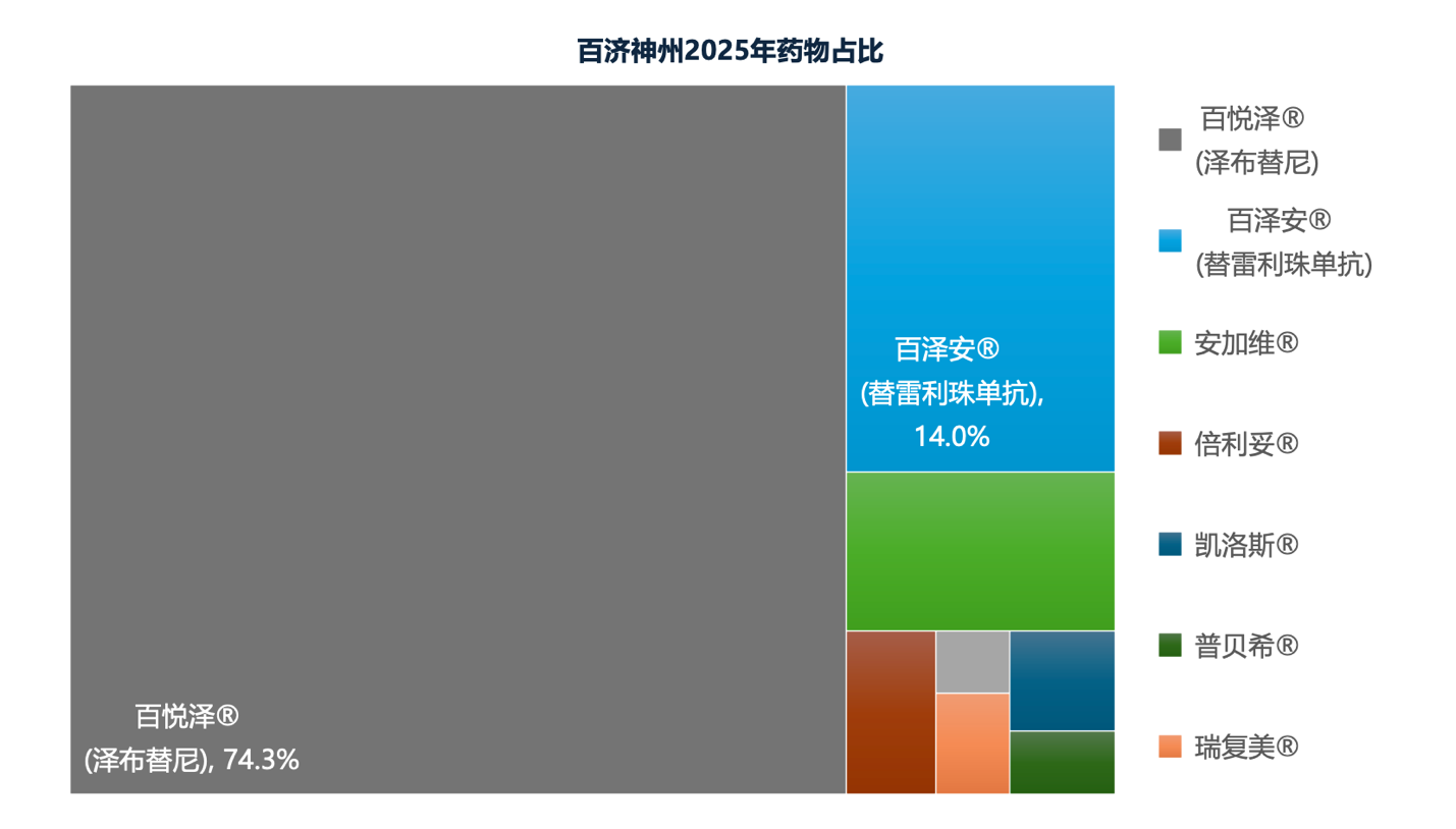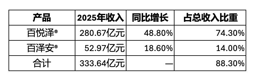 百济神州的业绩由百悦泽®(泽布替尼)和百泽安®(替雷利珠单抗)双核心产品驱动,2025年两款产品合计实现收入333.64亿元,占公司产品总收入的88.3%。
