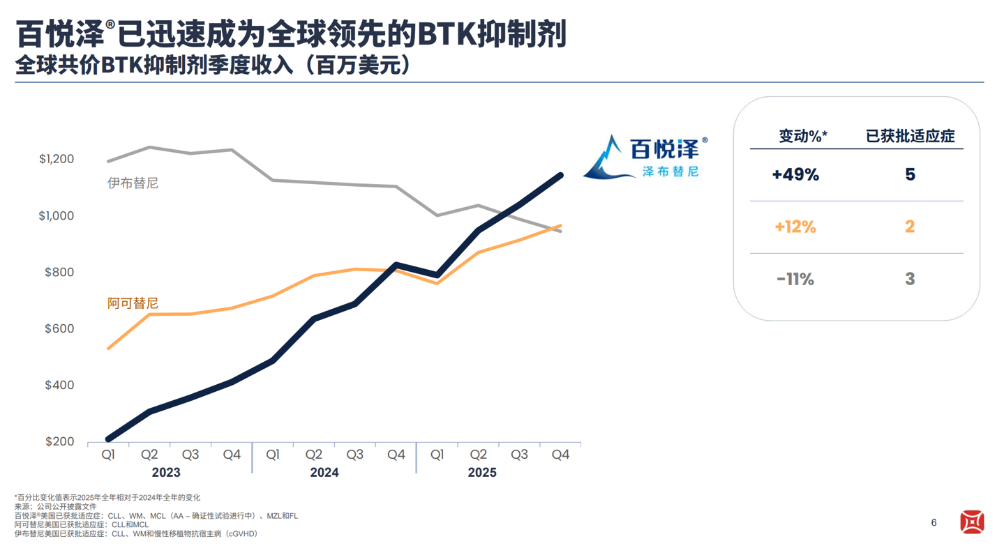 全球市场上,百悦泽®表现十分强势。百济神州业绩会披露的数据显示,2025年百悦泽®收入同比增长49%,而竞争对手强生(JNJ)和艾伯维(ABBV)共同商业化的伊布替尼(全球首个上市的BTK抑制剂)则同比下降11%,阿斯利康(PFE)旗下的新一代BTK抑制剂阿可替尼同比增长12%。