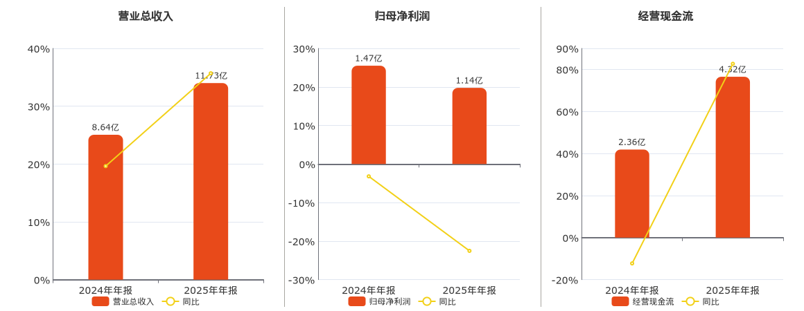 公司营业总收入为11.73亿元。归母净利润为1.14亿元,较去年同报告期归母净利润减少3199.15万元,同比较去年同期下降21.98%。经营活动现金净流入为4.32亿元。