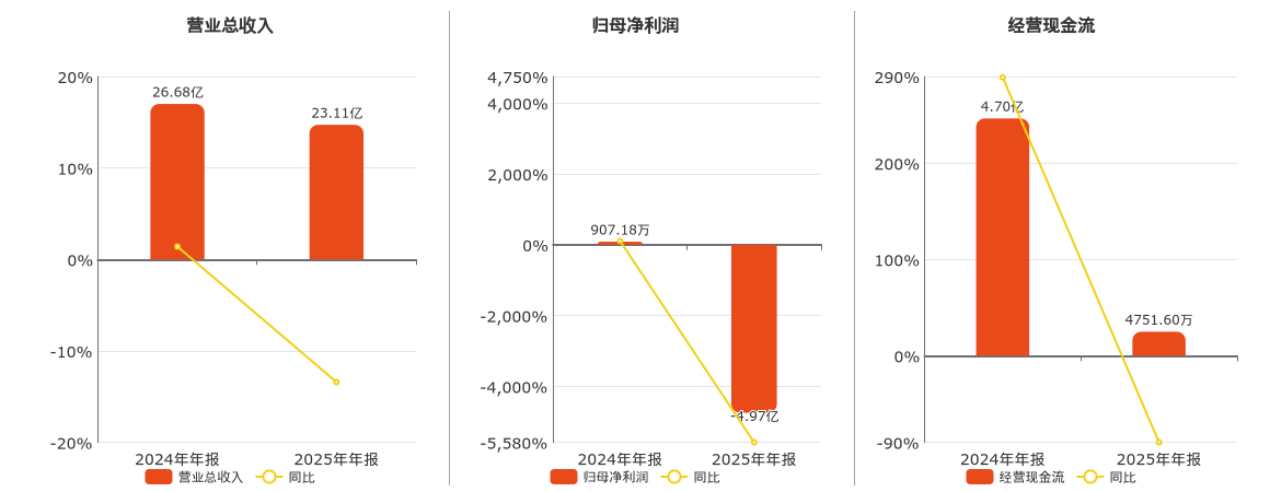 公司营业总收入为23.11亿元,较去年同报告期营业总收入减少3.58亿元,同比较去年同期下降13.41%。归母净利润为-4.97亿元,在已披露的同业公司中排名第62,较去年同报告期归母净利润减少5.06亿元,同比较去年同期下降5578.25%。经营活动现金净流入为4751.60万元,在已披露的同业公司中排名第46,较去年同报告期经营活动现金净流入减少4.22亿元,同比较去年同期下降89.88%。